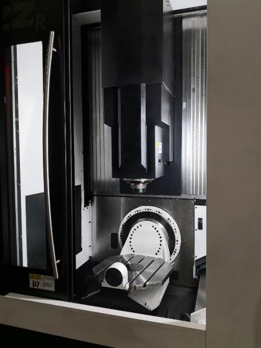 The JAZZ 5AX is a universal 5-axis machining center capable of meeting all high-dynamic and highly complex process machining requirements. It is available in three models: JAZZ R, JAZZ M, and JAZZ L. The base frame is made of DMP material specifically designed for milling machines, which is a composite material casting with damping vibration and high performance. (DMP: a new type of mineral casting, currently used in advanced machine tool production in Europe.) Two types of worktables are designed on the machine base, one is a fixed worktable, and the other is a cradle-type rotary worktable (C+B axis). The slide saddle carrying the column is mounted on the linear guide rails of the base, and the X and Y-axis movements are achieved by a transmission system composed of ball screws and guide rails. The spindle (optional with an electric spindle) is installed on the slide box bracket of the Z-axis and again uses a ball screw structure for movement. This model does not have a balancing cylinder, ensuring the dynamic performance of the machine at high speeds. A safety brake is installed at the upper end of the ball screw to ensure the safety performance of the Z-axis. The tool magazine is fixed on the side of the machine column. The working area of the machine is protected by a stainless steel inner guard.