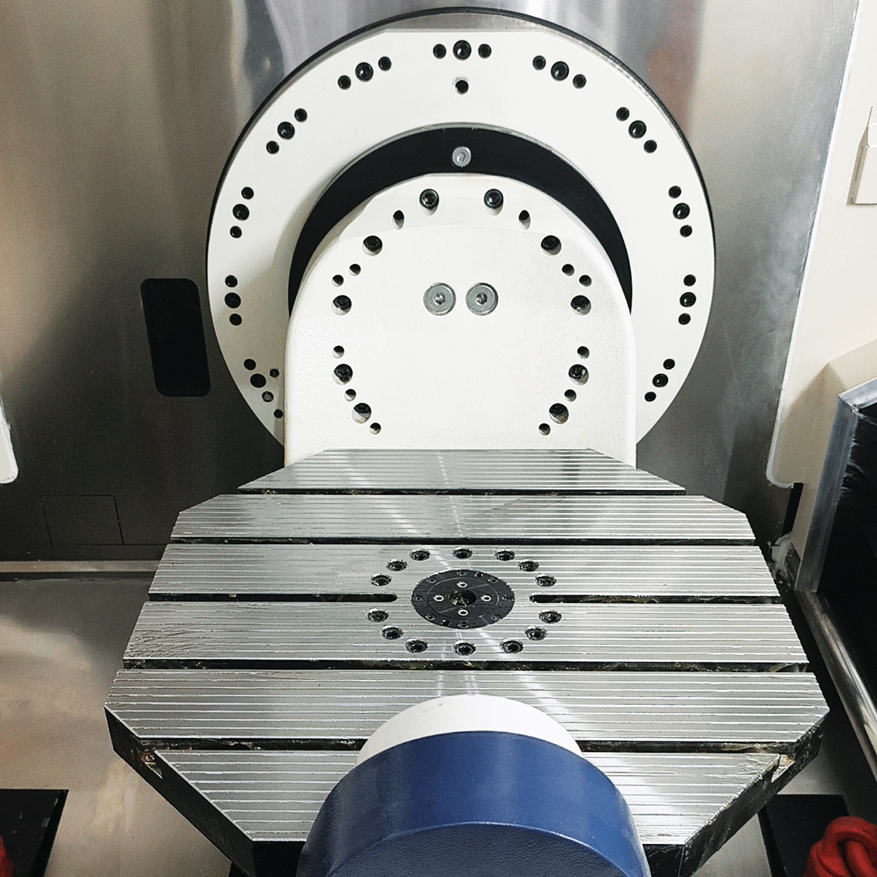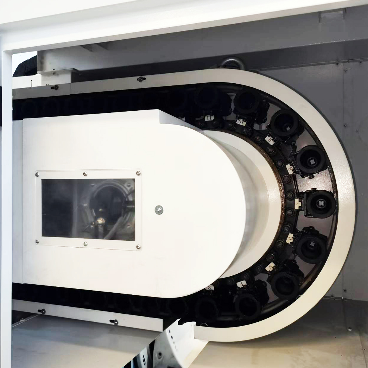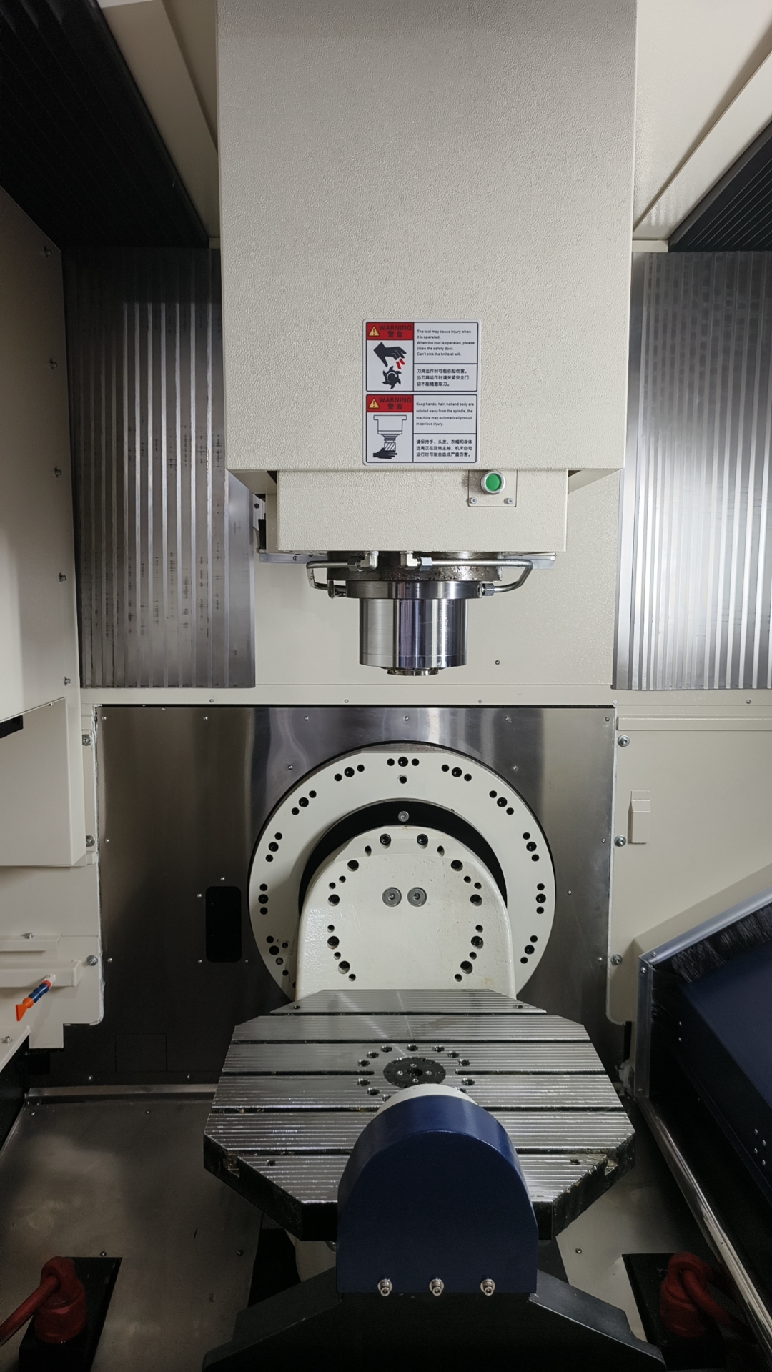 The GX650 5AX is a universal five-axis machining center, specifically designed for high dynamic and complex processing tasks. Its base frame is manufactured using the DMP process (DMP: a new type of mineral castings, currently widely used in the production of high-end machine tools in Europe), a composite material casting with excellent vibration damping performance and high strength characteristics. The machine base is equipped with a dual-mode worktable system, including a fixed worktable and a cradle-type rotating worktable (C+B axes). The column saddle is connected to the base through linear guides, and the X/Y-axis movements are driven by a high-precision ball screw guide system. The Z-axis adopts a slide rail structure and is equipped with an optional power spindle, also using a ball screw transmission mechanism. To optimize dynamic performance, this model features an unbalanced cylinder design, and a safety brake device is configured at the top of the Z-axis ball screw. The machine is also equipped with a column-side-mounted tool magazine, and the working area is designed with a fully enclosed stainless steel protective cover.